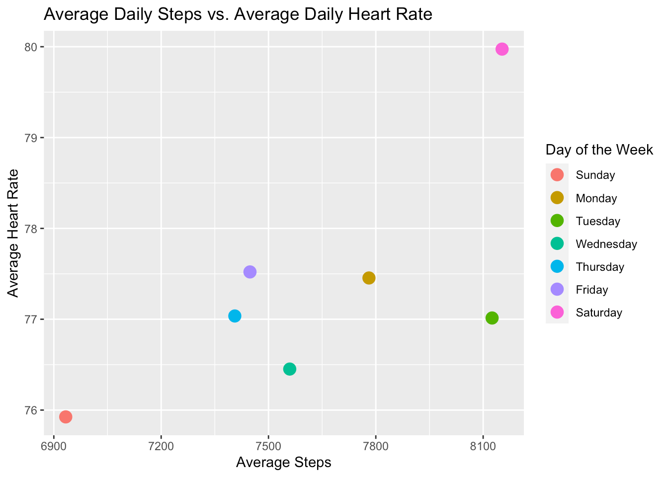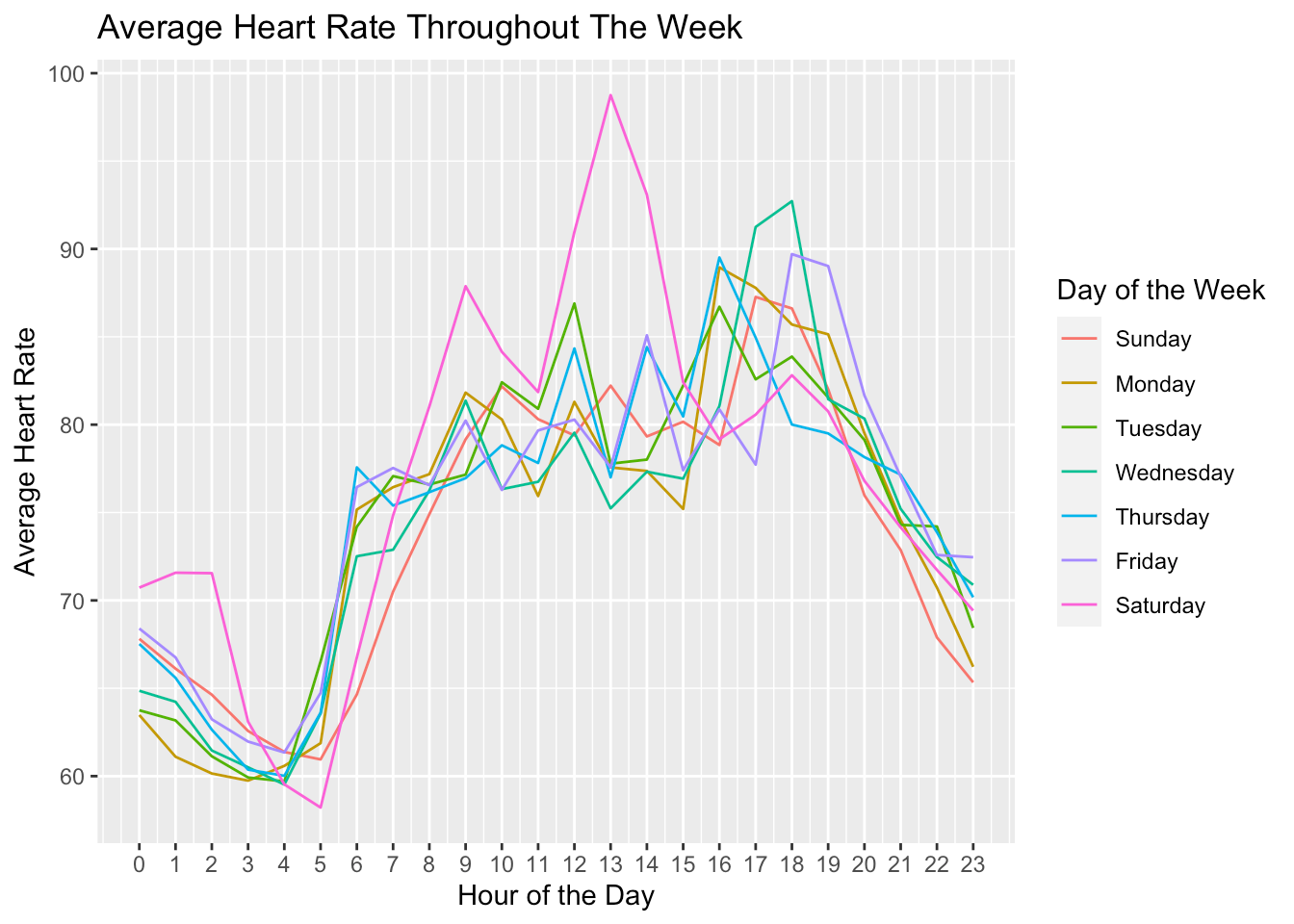 Sundays see the lowest activity levels, indicating a day reserved for rest. Nighttime heart rates, particularly low between 10 p.m. and 5 a.m., suggest typical sleeping patterns, with no significant upticks on weekend nights, hinting at a possibly older or more health-conscious demographic.