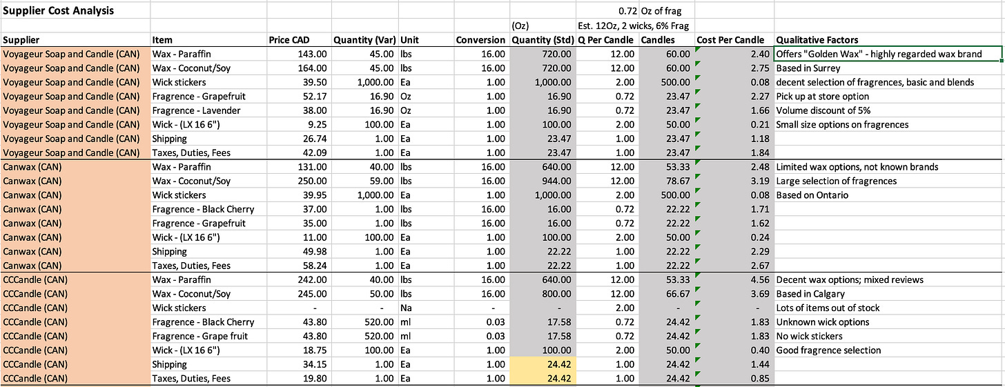 Then came the quest for finding the best supplier. I needed to find a balance between cost-effectiveness and quality. My accounting background coming into play, I performed a quick cost analysis and added in some qualitative notes based on reviews, product offerings, etc. You can see a screenshot of the analysis for one supplier below.