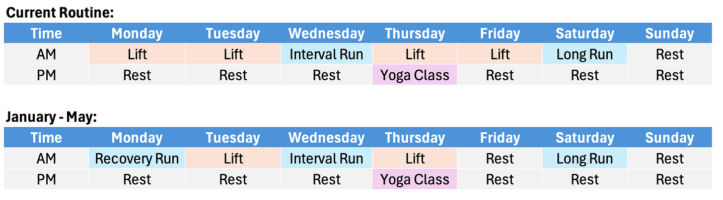 Black’s framework in Tactical Barbell felt different. Again, by accepting tradeoffs, I better understood how I could simplify my program to just 3-4 compound movements across 2-3 weekly sessions helped me stay consistent without overloading my body. By ruthlessly shifting focus away from hypertrophy and committing to minimalistic but frequent strength training, I should be able to maintain, and maybe grow, my strength while preparing for a half-marathon (which I recently signed up for). I now have extra time each week to dedicate to running, confident that I’m still building functional strength to support my goals.